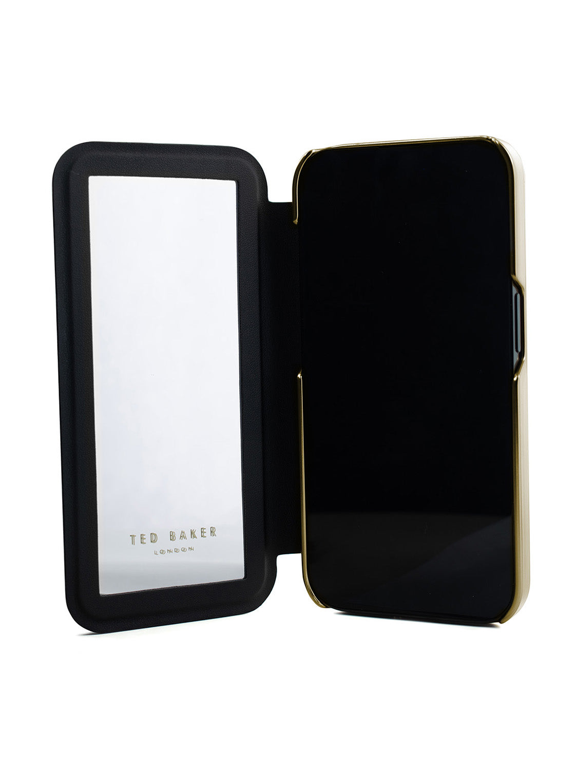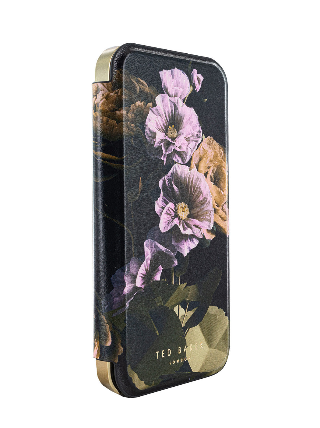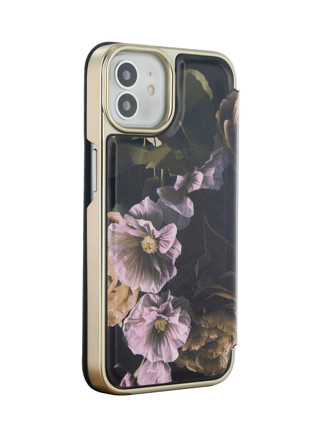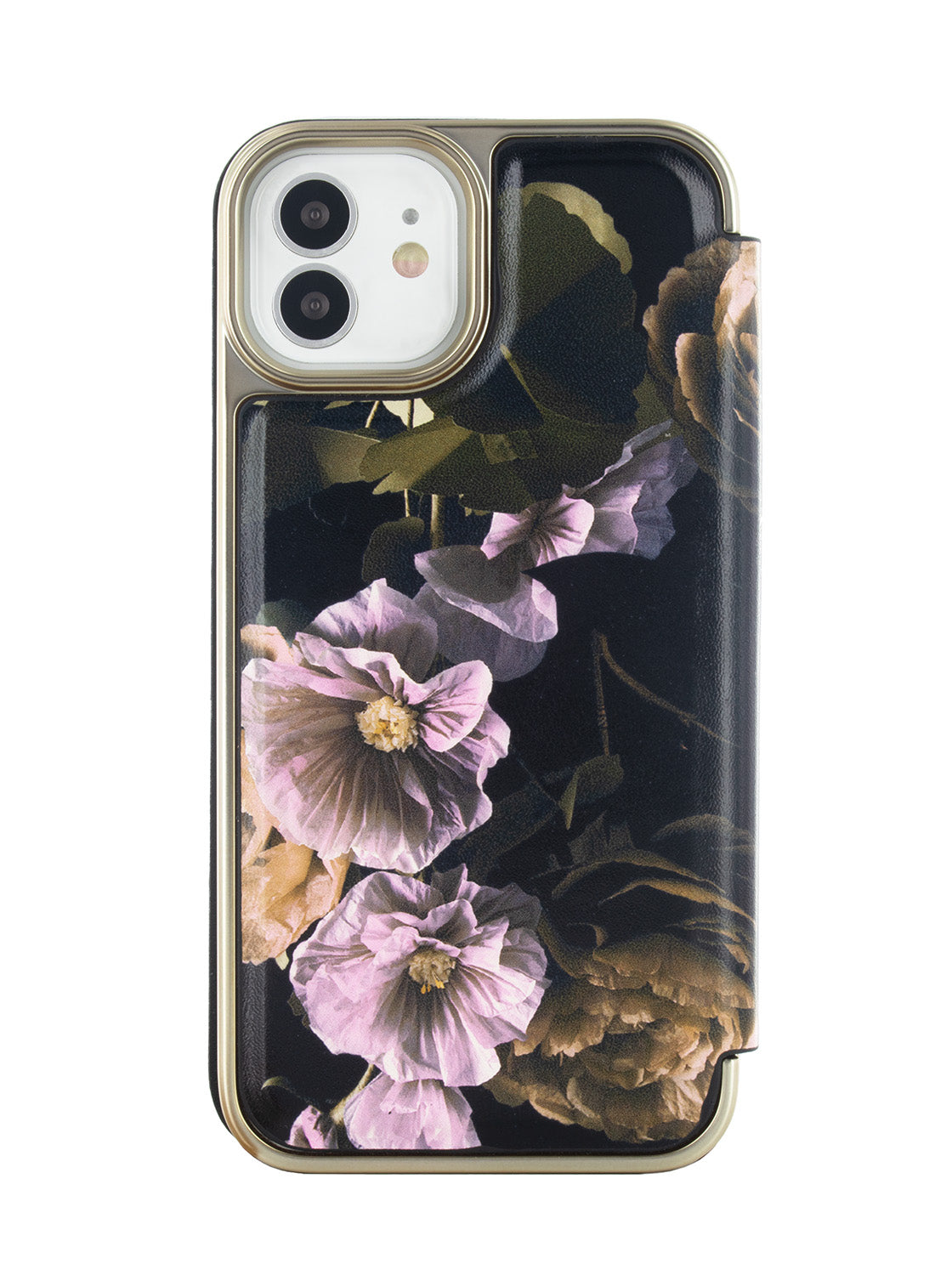 Introducing the stylish and sophisticated Ted Baker GLADIAS Black Paper Flowers Mirror Folio Phone Case for iPhone 12 Gold Shell. This premium phone case is designed to keep your phone protected while also making a bold fashion statement.